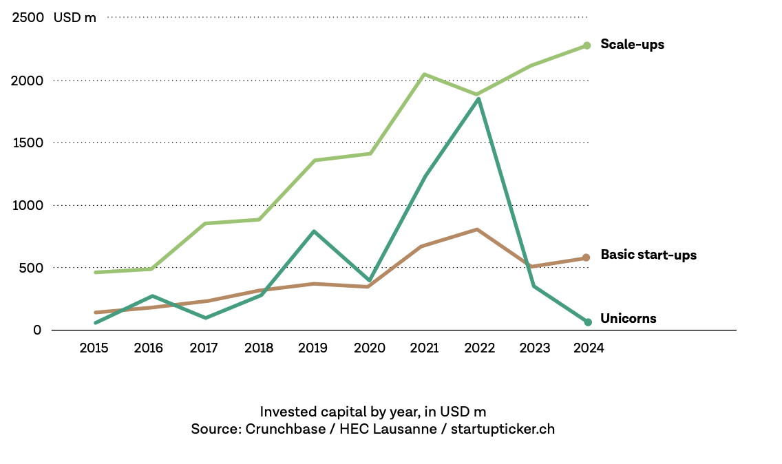 - Capital invested in Swiss scale-ups has increased nearly fivefold between 2015 and 2024.
