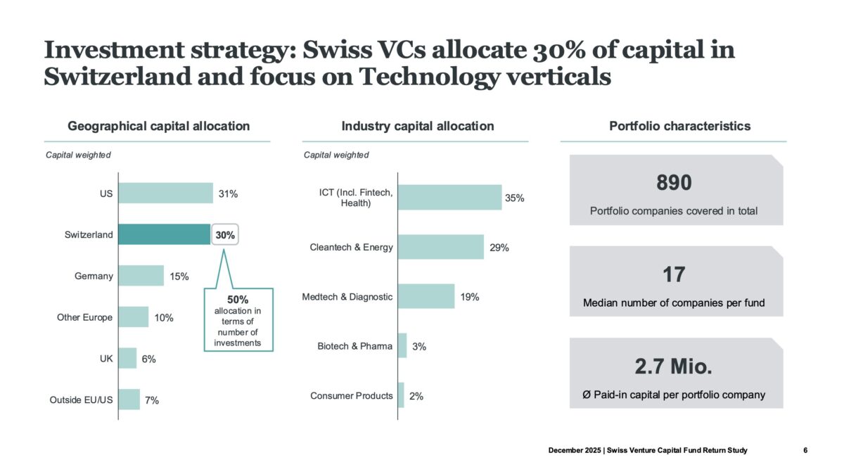 The sectoral focus is equally clear. Technology, including ICT, fintech, and healthtech, accounts for 35% of deployed capital. Cleantech and energy follow at 29%, with medtech and diagnostics at 19%. The median fund manages portfolios of around 17 companies, with an average investment of CHF 2.7 million per company.