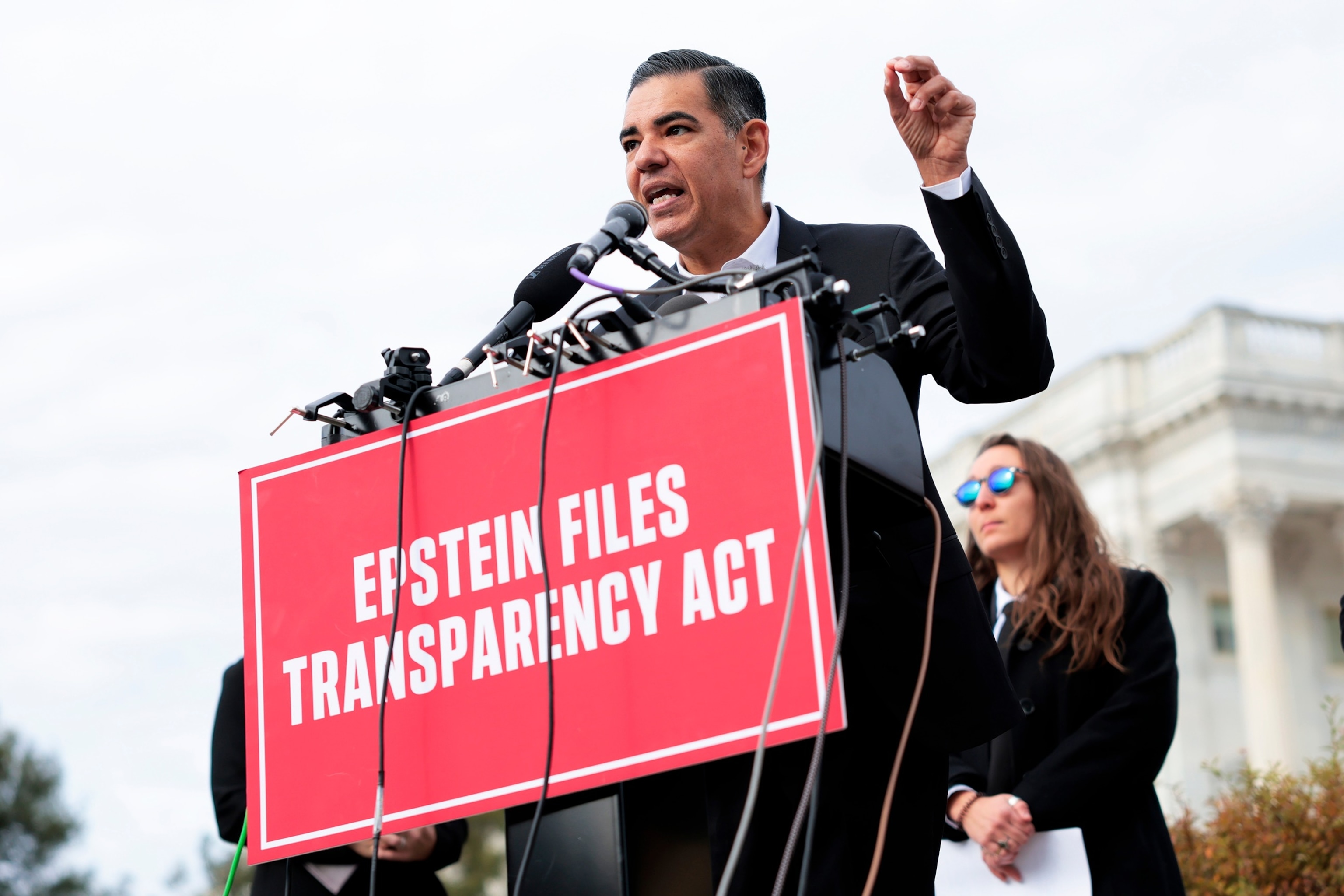 In this Nov. 18, 2025, file photo, Rep. Robert Garcia speaks during a news conference on the “Epstein Files” outside the U.S. Capitol in Washington, D.C.