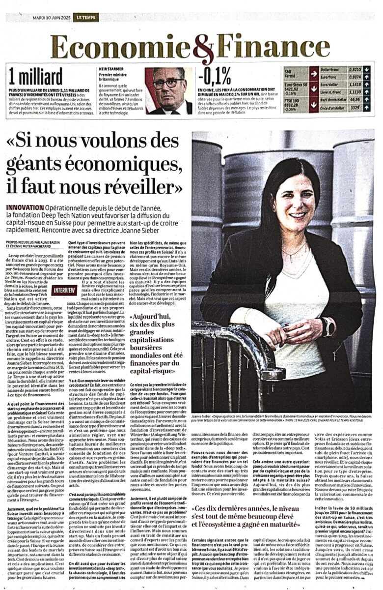 Our CEO, Joanne Sieber, recently sat down with the influential Swiss newspaper Le Temps to discuss a critical challenge for the nation’s future: financing the growth of our most promising deep tech companies. The interview sheds light on why Switzerland, a world champion in innovation, must now focus on the commercialization of that innovation to create the economic giants of tomorrow.