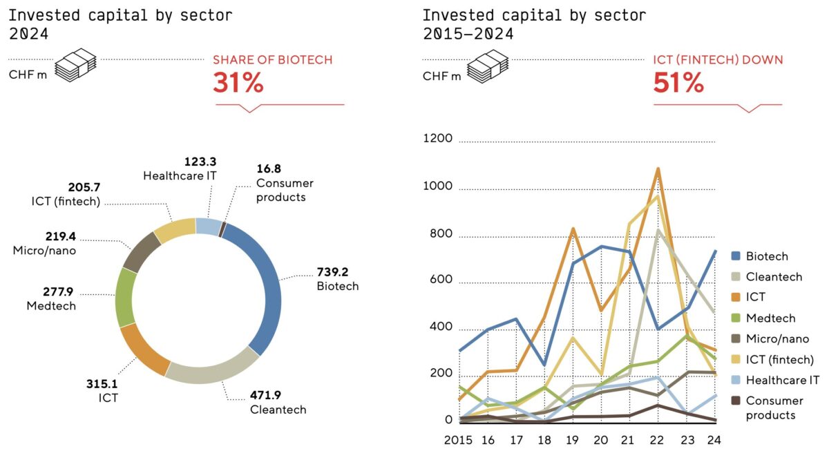 Switzerland’s biotech & techbio sector attracted CHF 739.2 million in 2024, a 50% increase over the previous year, making it the country’s best-performing tech vertical . But quantity does not equal quality when it comes to stage distribution. The median later-stage round was just CHF 12 million, too small to move the needle for companies building complex industrial and therapeutic platforms.
