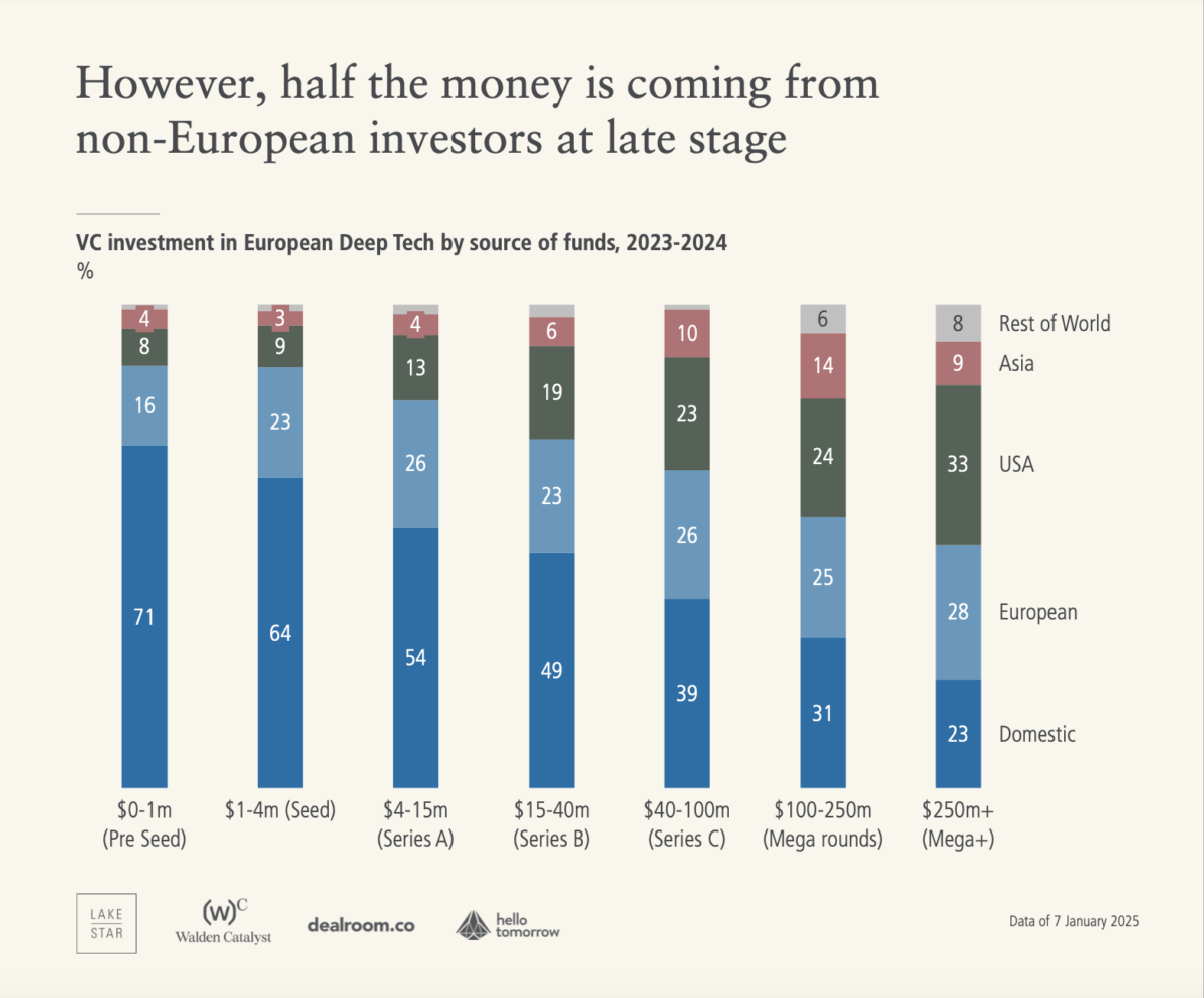 Across Europe, the 2025 European Deep Tech Report confirms the trend: while early-stage capital is abundant, 50% of all growth-stage funding comes from outside Europe. Deep Tech companies require more capital to scale, particularly due to CapEx-intensive models that build IP and manufacturing moats rather than buying market share.